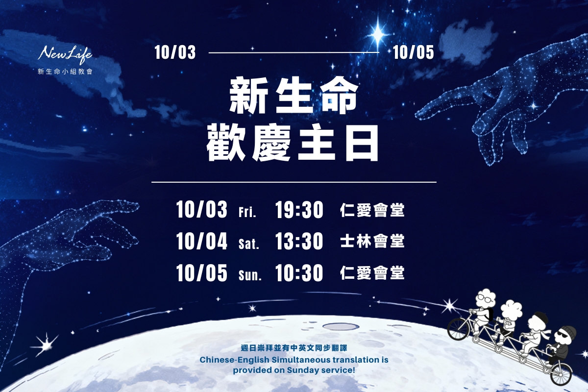 本週主日資訊 More 10/3-10/5 新生命歡慶主日 頭條快報 最新消息 2025.03.16 【教會報導】2025同工退修會——牧養人的靈魂,起來做教會領袖 More 小組頻道 More. 欣美小組 More. 昌賢小組 More. 朵拉小組 小組頻道 欣美小組 昌賢小組 朵拉小組 More