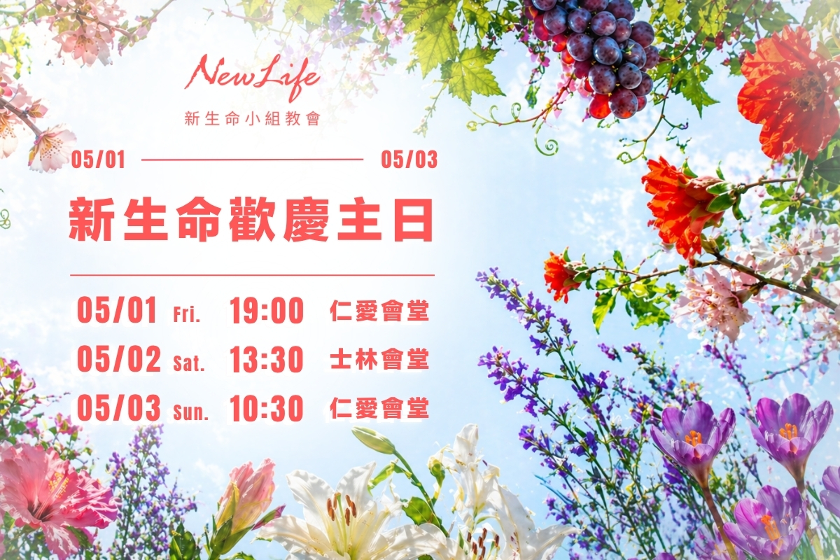 本週主日資訊 More 4/10-4/12 新生命歡慶主日 頭條快報 最新消息 2026.01.30 新生命30週年:破釜沉舟回歸根基,按立副主任牧師團隊開啟倍增新氣象 More 小組頻道 More. 欣美小組 More. 昌賢小組 More. 朵拉小組 小組頻道 欣美小組 昌賢小組 朵拉小組 More