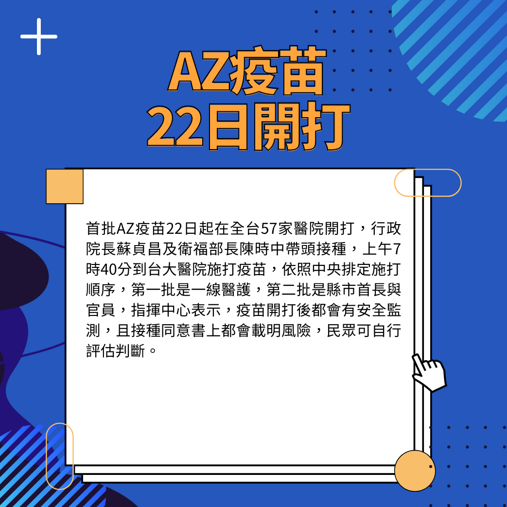 首批AZ疫苗22日起在全台57家醫院開打,行政院長蘇貞昌及衛福部長陳時中帶頭接種,上午7時40分到台大醫院施打疫苗,依照中央排定施打順序,第一批是一線醫護,第二批是縣市首長與官員,指揮中心表示,疫苗開打後都會有安全監測,且接種同意書上都會載明風險,民眾可自行評估判斷。