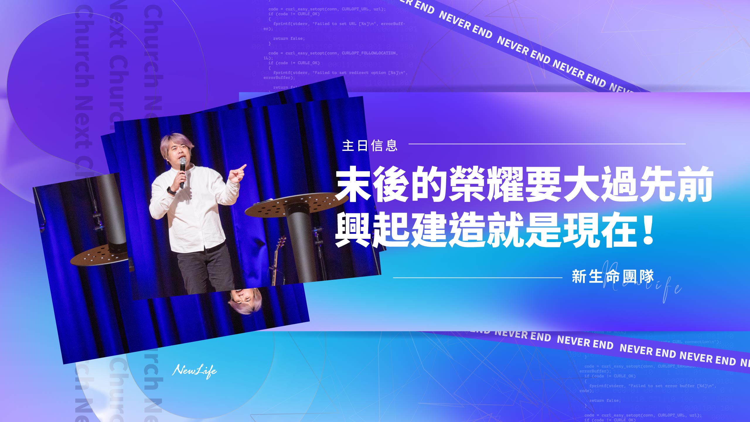 新生命團隊鼓勵弟兄姊妹,跟上上帝榮耀的建造,因為「神為愛他的人所預備的,是眼睛未曾看見,耳朵未曾聽見,心也未曾想過的」。就是現在,把自己交在上帝手中,一起來建造榮耀的教會。