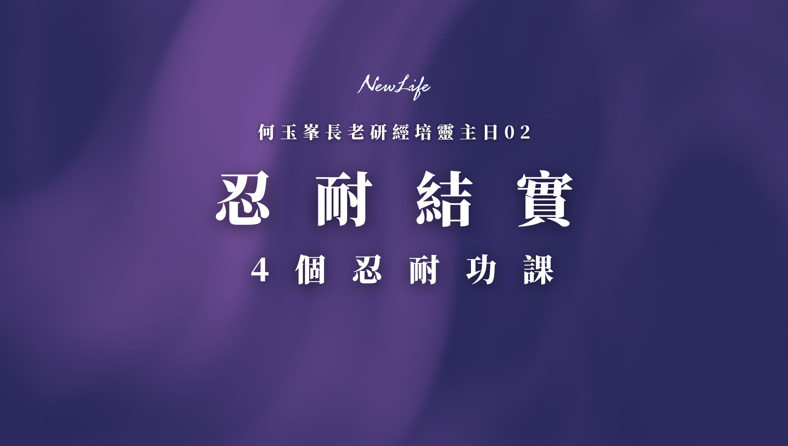 加上「忍耐」:忍耐是讓環境給我們功課,使人耐得住各樣的考驗。環境不可能讓我們一帆風順,有時候面對世界的誘惑、罪惡的試探,需要忍耐,有時候是突如其來的考驗臨到,我們也需要耐得住。透過忍耐,操練堅定不移的倚靠神,幫助信仰夠紥實,生出真正屬靈的忍耐。
