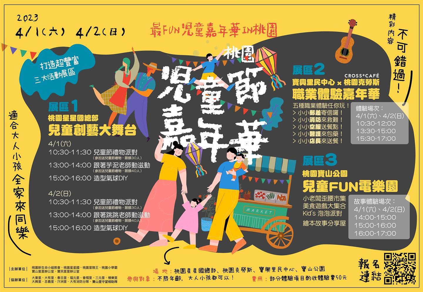 今年兒童節共五天連假,為了讓孩子們有個不一樣的兒童節,桃園新生命小組教會星星國、冒險王、小學霸,連結桃園區寶山里等五個里、大有消分隊等,共同打造桃園最好玩的「2023 桃園兒童節嘉年華」,在4月1、2日兩天,分別在桃園星星國總部、桃園克勞斯、寶興市民活動中心、寶山公園展開,打造超豐富三大活動展區,適合大人小孩全家來同樂!